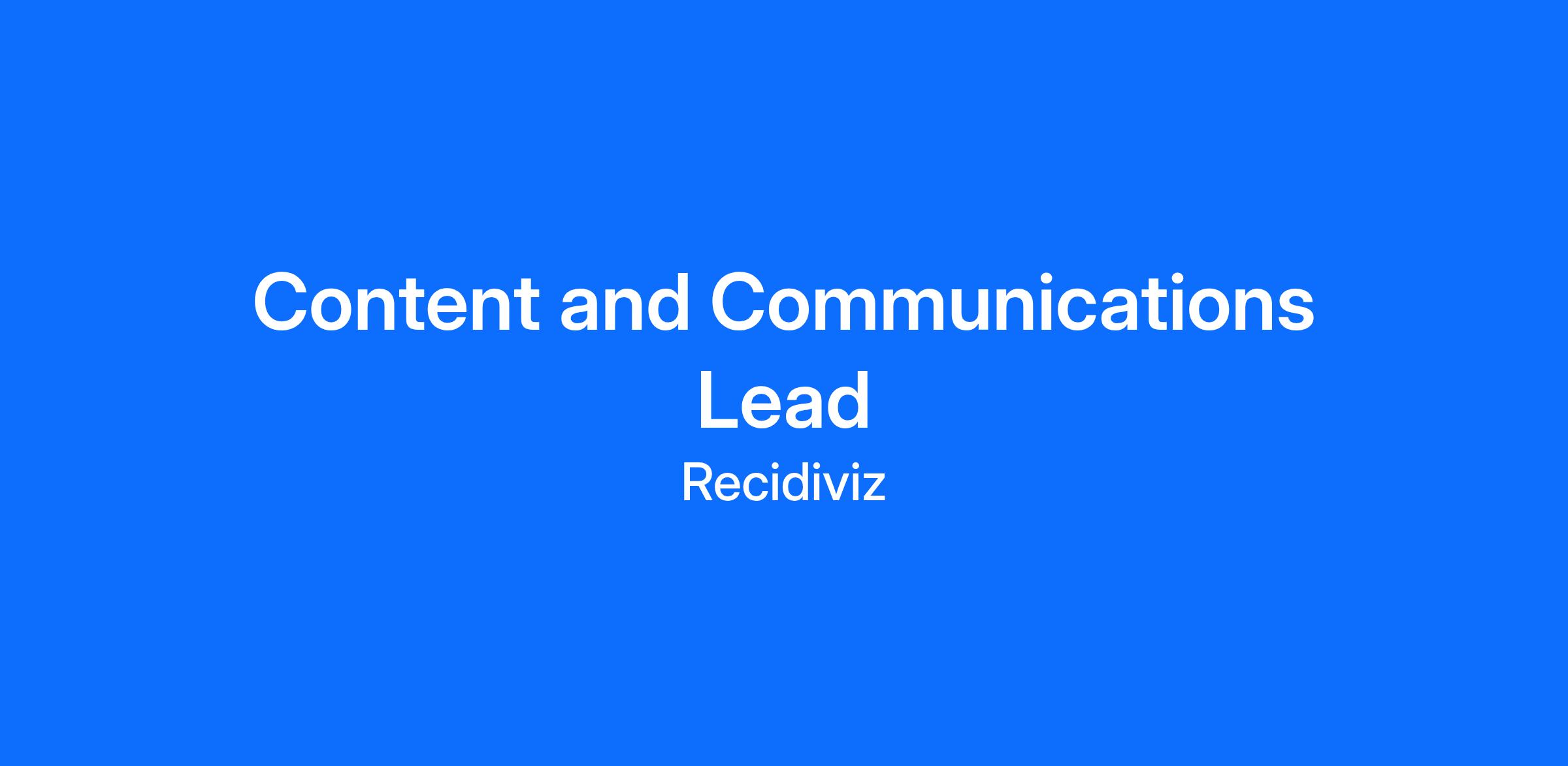 Recidiviz is thrilled to be hiring a Content & Communications Lead to join our marketing team! Weâre a small, fast-moving group that creates moments and messages that drive our mission forward.