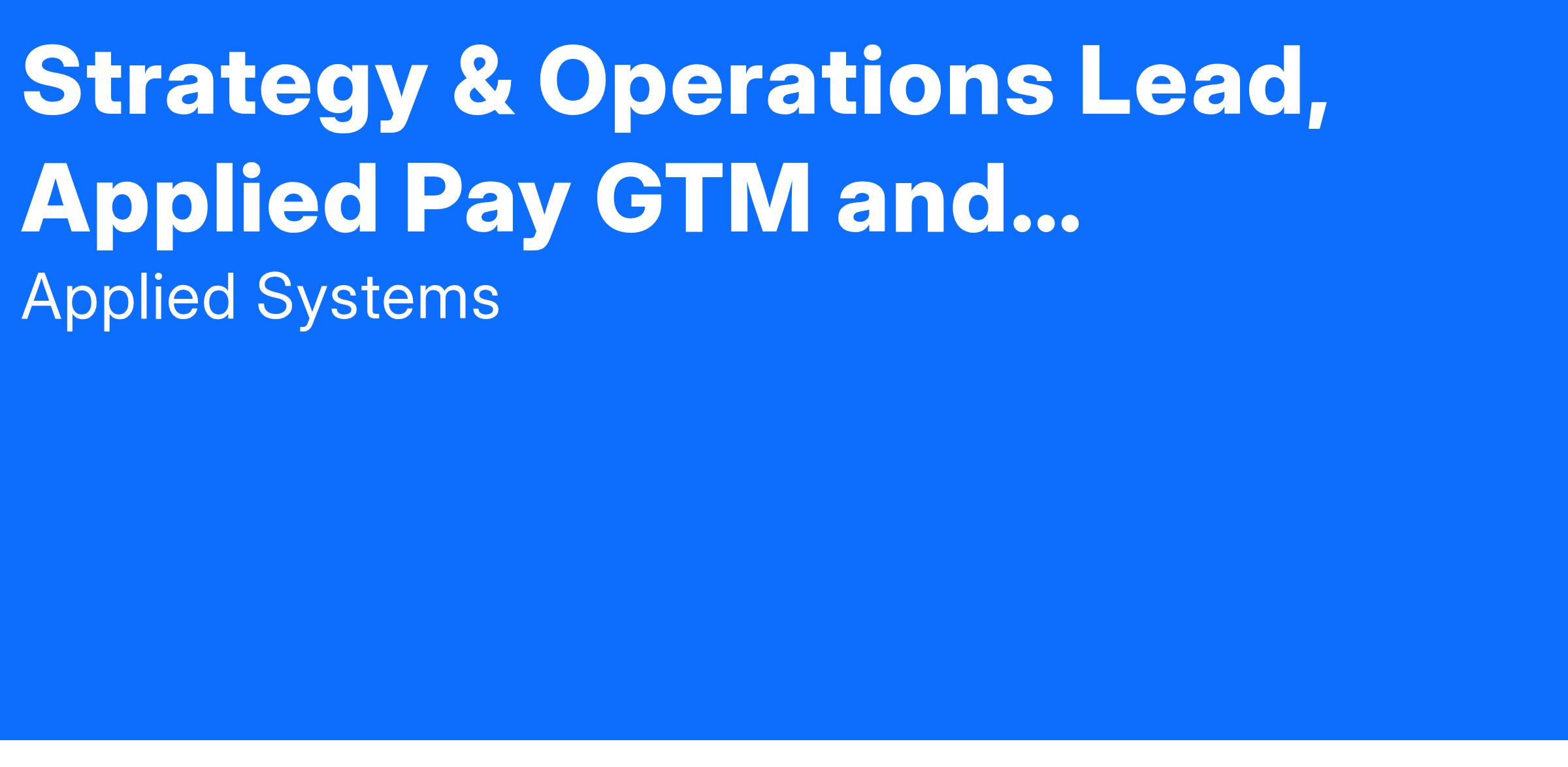 Applied Systems, Inc., a worldwide leader in insurance technology, is currently searching for a highly motivated and results-oriented Strategy & Operations Lead to join our Applied Pay team focusing on our go-to-market operations and partnerships. The Strategy & Operations Lead is responsible for optimizing our go-to-market operations, negotiating new partnership deals, and managing ongoing coordination with existing partners. This individual will also support Applied Pay’s strategy planning processes and will regularly lead key initiatives that result from that process.